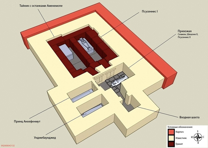 Еще одно отличие подземных гробниц в Танисе – они не зарывались так глубоко в землю, как в фиванском царском некрополе – в Долине Царей. Их рыли открытым способом – сначала котлованы, потом укрепляли их каменными блоками, сверху перекрывали ими же, а после закидывали землей, сравнивая с поверхностью. Причина такой техники проста – грунтовые воды в дельте Нила находятся слишком близко от поверхности, что не позволяло углубляться сколько-нибудь значительно.