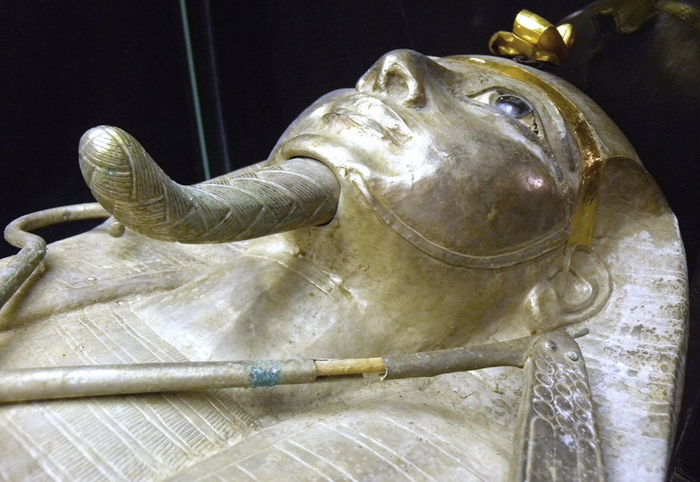 Серебряный соколообразный саркофаг Шешонка II. Маленькие антропоидные "саркофаги" на самом деле канопы, в которых хранились внутренности фараона.