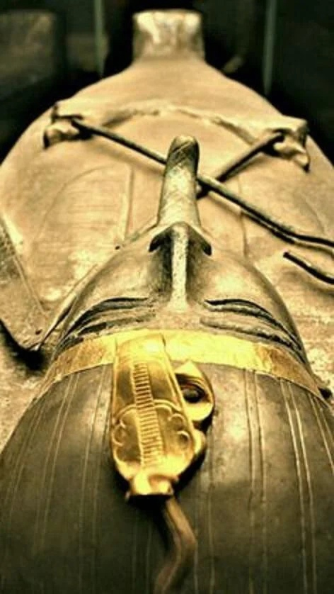 Золото, что блестело сквозь повреждения серебряного гроба – это золотое покрытие внутреннего соколиного саркофага, сделанного из льна, лака, склеивающего состава (своего рода папье-маше), покрытого в свою очередь тонкими листиками золотой фольги. Эту фольгу видно на первом черно-белом фото, сам внутренний саркофаг успешно истлел, но реставраторы смогли восстановить внешний вид.