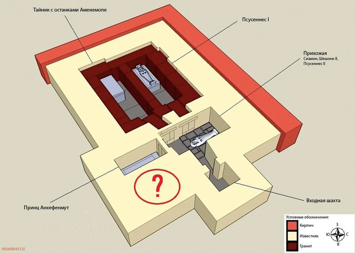 Увы, после расшифровки надписи над входом стало ясно – это не погребение самого фараона. Надпись была длинной и пышной титулатурой древнеегипетского вельможи Анхефенмута, приближенного фараона Псусеннеса I-го.