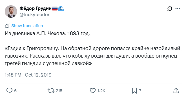 Если изучить историю публикаций цитаты в Сети, то можно обнаружить, что она начала хождение там только во второй половине 2019 года, сразу став вирусной. Старейшая запись, найденная «Проверено», датирована 12 октября — тогда её опубликовал в Twitter (теперь соцсеть X) пользователь Фёдор Грудин (@luckyfeodor).