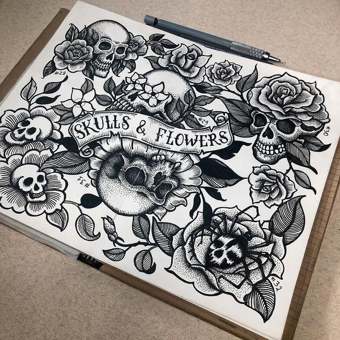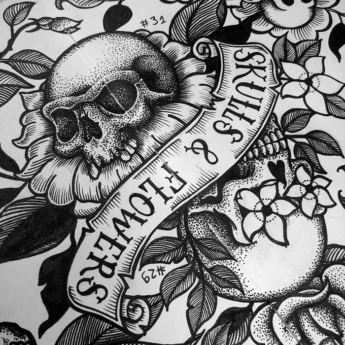 Тоже череп-и-цветочки, но тут всё по олд-скулу. Люблю вот этот всратый графический стиль олд-скул тату)