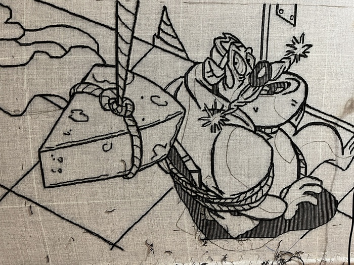 Получатель подарка обожает героя из мульт-сериала "Чип и Дейл" - мышонка Рокфора. Поэтому думать над сюжетом особо долго не пришлось. Эскиз - основа такого ковра, рисунок должен быть крупным, четким, чтобы его можно было аккуратно заполнять цветом. Это очень похоже на обычную раскраску - только полотно с наш рост.