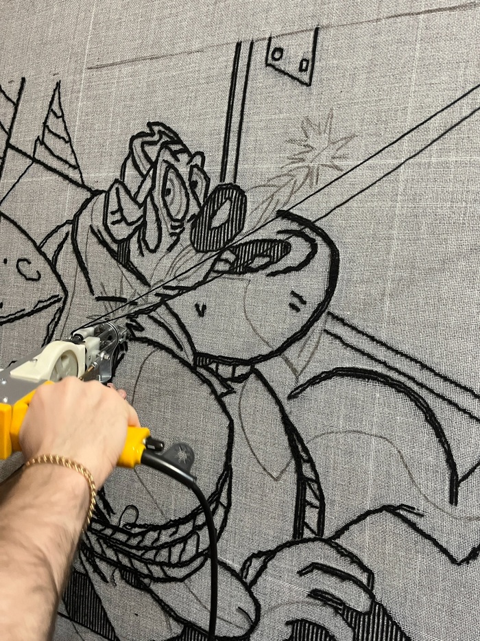 ▎3. Процесс тафтинга Теперь начинается самый интересный этап — тафтинг. Мы начинаем с обводки контура.