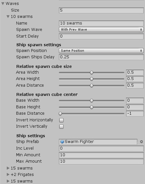 Для каждой волны нам нужно знать, какого противника нужно генерировать и в каком количестве. Для этого нам достаточно указать ссылку на объект-противника (префаб) и задать минимальное и максимальное количество. Еще можно указать уровень противника. Это некий показатель, от которого будут зависеть урон, жизнь, скорость передвижения и другие параметры противника.