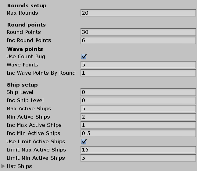Через несколько дней ко мне в голову пришла светлая мысль: игрокам не важно, как расположены противники, в каком месте и в какой последовательности они появляются. Поэтому мы можем использовать случайны числа! Выбирать случайный тип корабля, случайное количество и т.д. Но при этом оставалась проблема с нарастающей сложностью, ведь надо было как-то высчитывать, сколько кораблей должно быть в волне, сколько всего в раунде, как они будут изменяться...