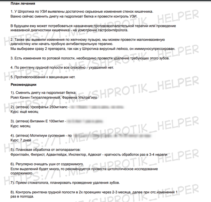 — Лечение лишая, подбор подходящего корма. — Консультация дерматолога, анализы на лишай. — Консультация нефролога. — Повторное УЗИ, анализы крови и мочи, дополнительные исследования для выявления проблем с ЖКТ.