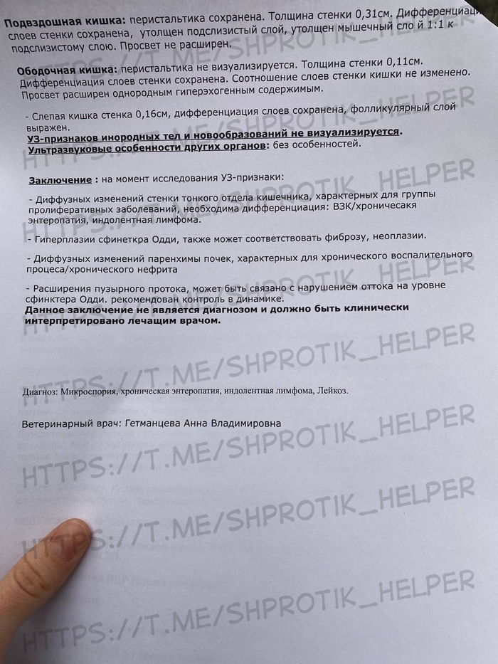 К сожалению, лишай оказался не единственной проблемой. У Шпротика начались сложности с ЖКТ: пропал аппетит, появились периодические боли в животе. Недавнее УЗИ показало хроническое воспаление кишечника, утолщение его стенок и непонятные мне проблемы, связанные со сфинктером Одди. Это тревожный сигнал, и нам предстоит разобраться, что именно с ним происходит. В ближайшее время планируем дополнительные исследования, анализы и консультацию нефролога.
