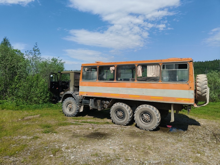 К тому времени проснулись остальные члены нашей команды, и мы стали завтракать. Мимо по дороге к горе Полюд проезжали оригинальной конструкции местные болотоходы, на которых туристов возят большую часть дороги до тех мест, где по ней еще реально проехать. Мы же после завтрака отправились вслед за ними покорять данный путь пешком. Дорога имеет протяженность 7 километров в одну сторону и пользуется немалой популярность. По началу она довольно ровная, песчаная и идет через лес мимо живописных полянок.