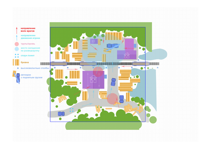 После сбора достаточного количества материалов дизайнер приступает к созданию план-схемы, определяя размер карты, игровую область (синяя линия на примерах снизу) и расстановку ключевых объектов сцены. В процессе этой работы создается ни один, а несколько вариантов схем с разным расположением элементов, которые затем утверждаются гейм-дизайнером и арт-директором.