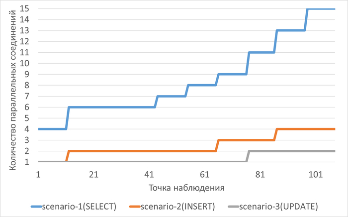 cpu_id (время простоя): Снижается с ~33% в начале до ~10-13% в конце тестов, так как процессор все больше времени ждет IO.