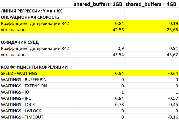 Прямой зависимости скорости работы СУБД от скорости чтения с диска (корреляция speed и shared_blks_read >0.97).