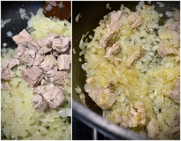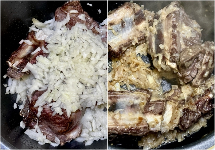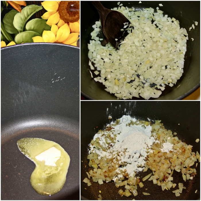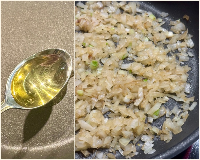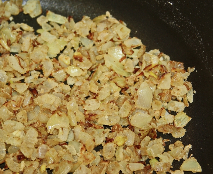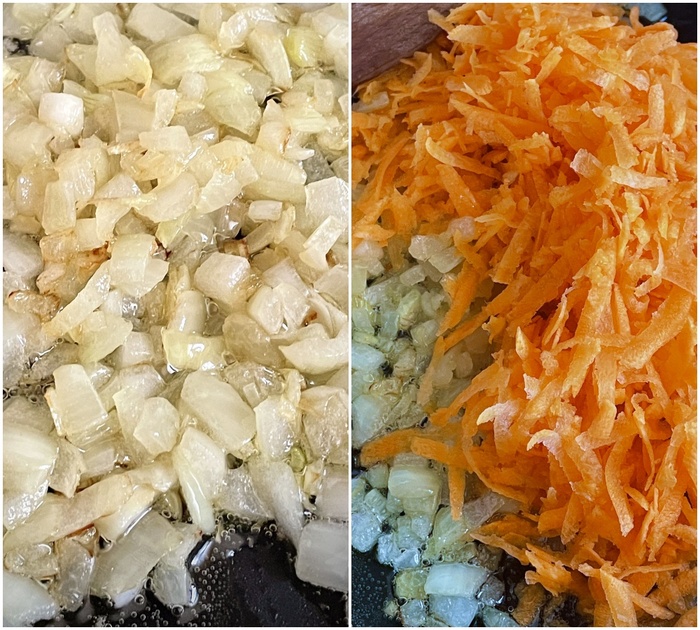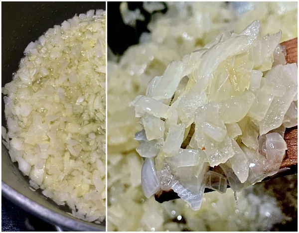 На нагреве «ниже среднего», постоянно помешивая, довожу до предпрозрачности. Умягчаю и выпариваю резкий луковый аромат.