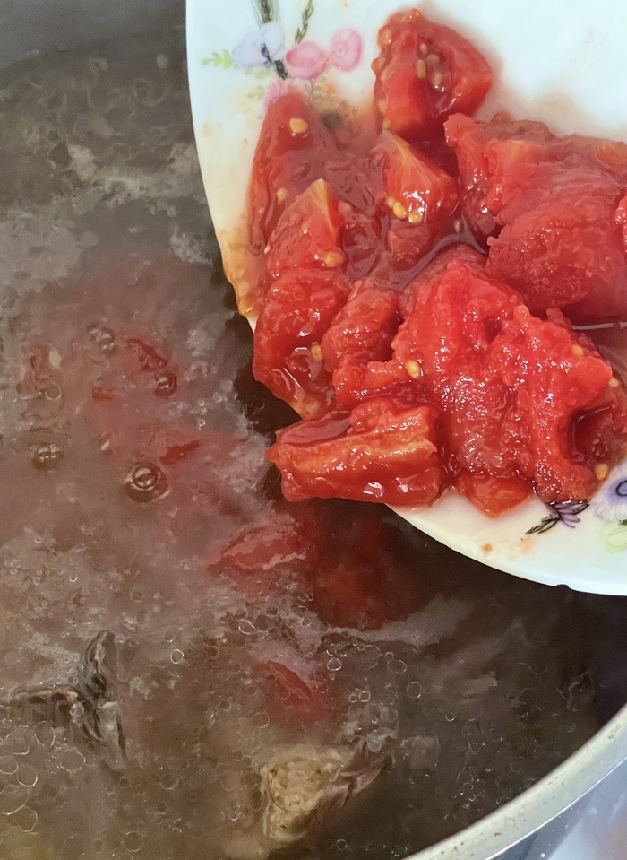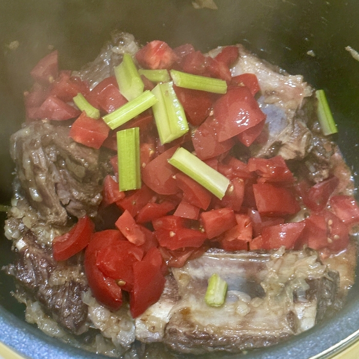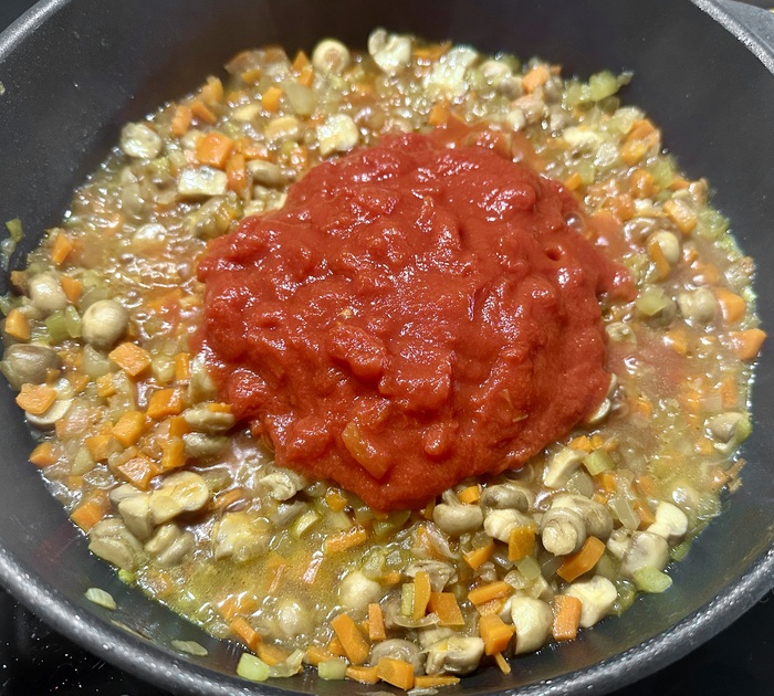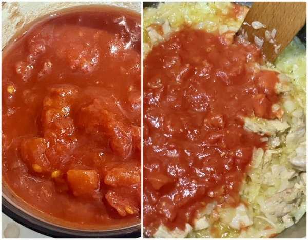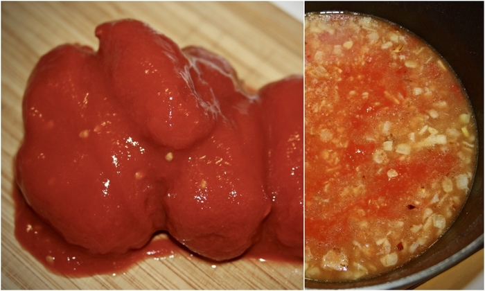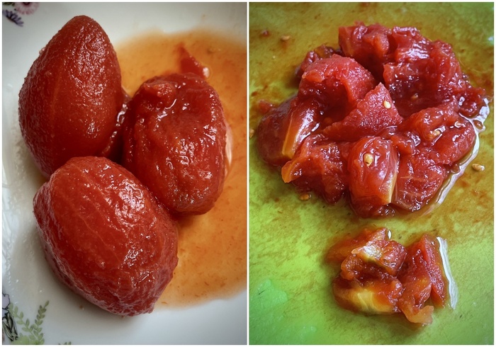 Помидоры. Не оказалось свежих в запасе. Баночка «рубленых в собственном соку» в дело пошла.