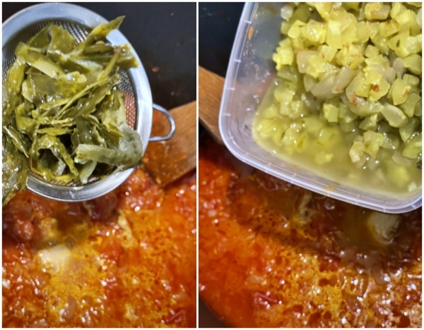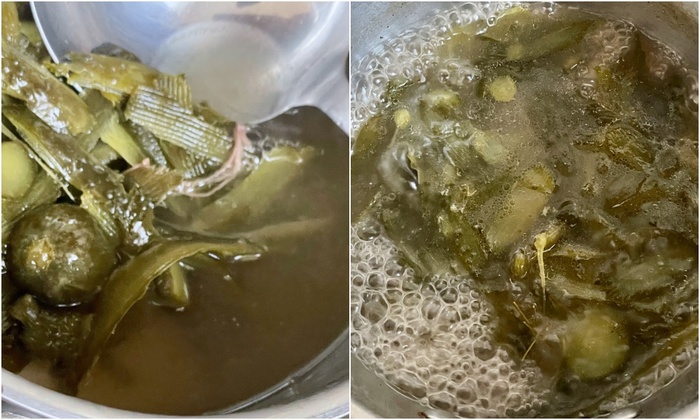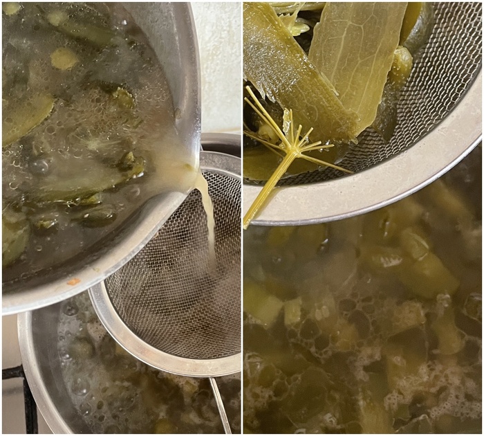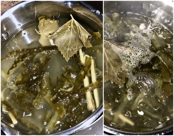 Кожуру в сотейник и заливаю ее рассолом. Огуречным. Стакан беру рассола. Довожу до кипения, убавляю нагрев, даю слегка побулькать пару-тройку минут. Всё.