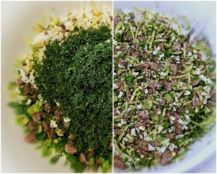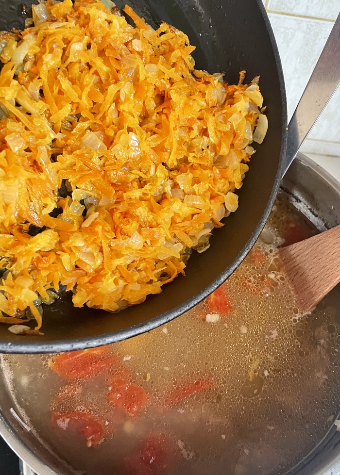 И в бульон. Содержимое сковороды – в бульон. Аккуратно выложил и перемешал.