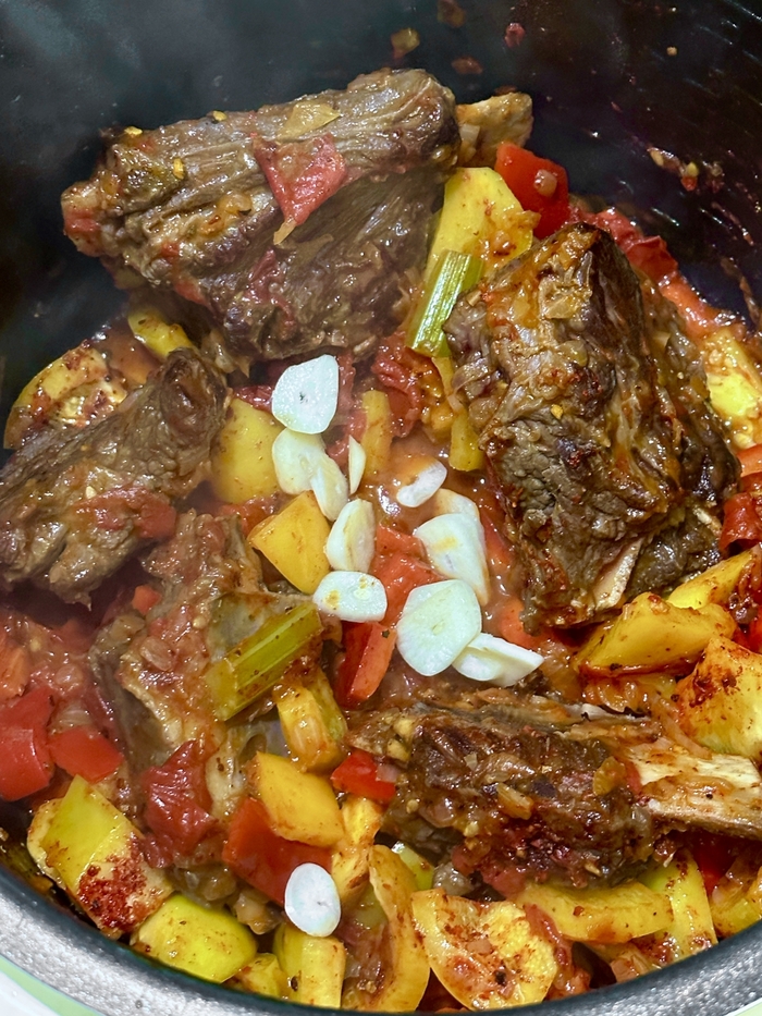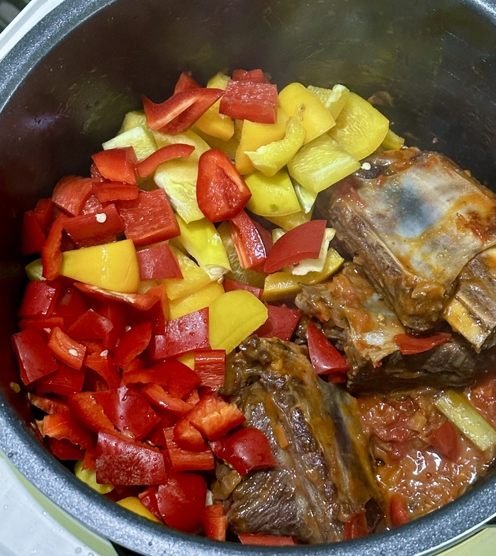 Потом добавил огурцы и еще минут десять тушил в том же режиме.