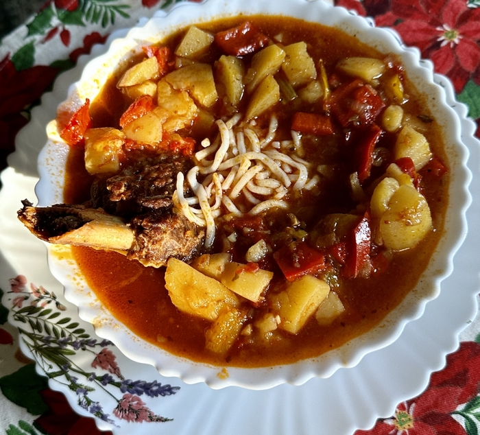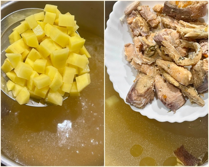 Бульон хорошо процедил. Через два сита. Основой бульона послужил суповой набор семужий. Там всякие кости – плавники помимо головы были, ну так вот – дабы избежать, лучше процедить тщательно.