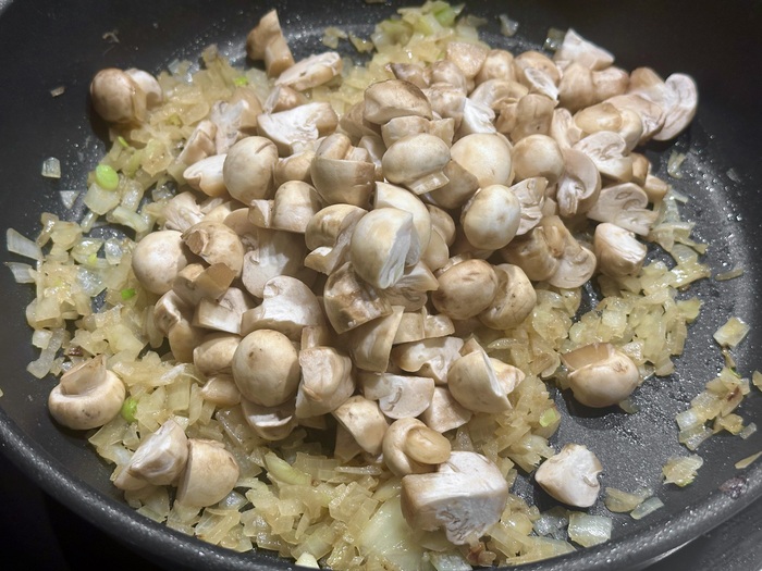 Некрупные шампиньоны. Если крупный, то и порезать можно. Выложил в лук и перемешал деликатно – аккуратно.
