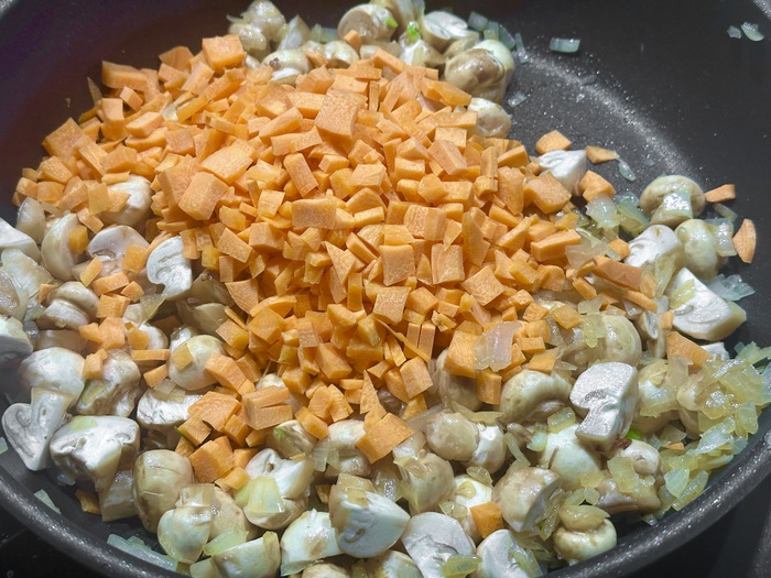 Немного прогрел. Буквально пару минут и мелко нарезанную морковку тоже в сковороду отправил.