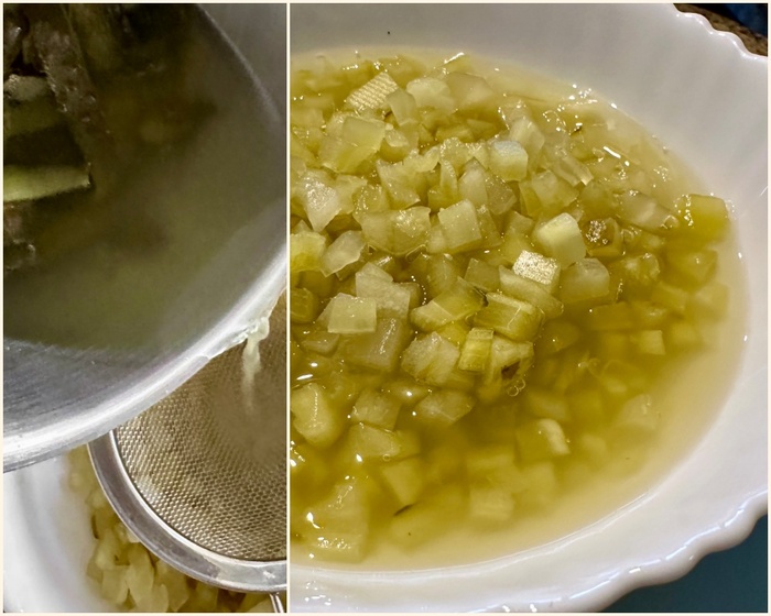 Сами огурцы режу мелким кубиком. И уже нарезанные заливаю прямо горячим рассолом.