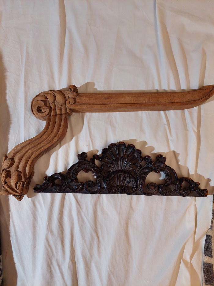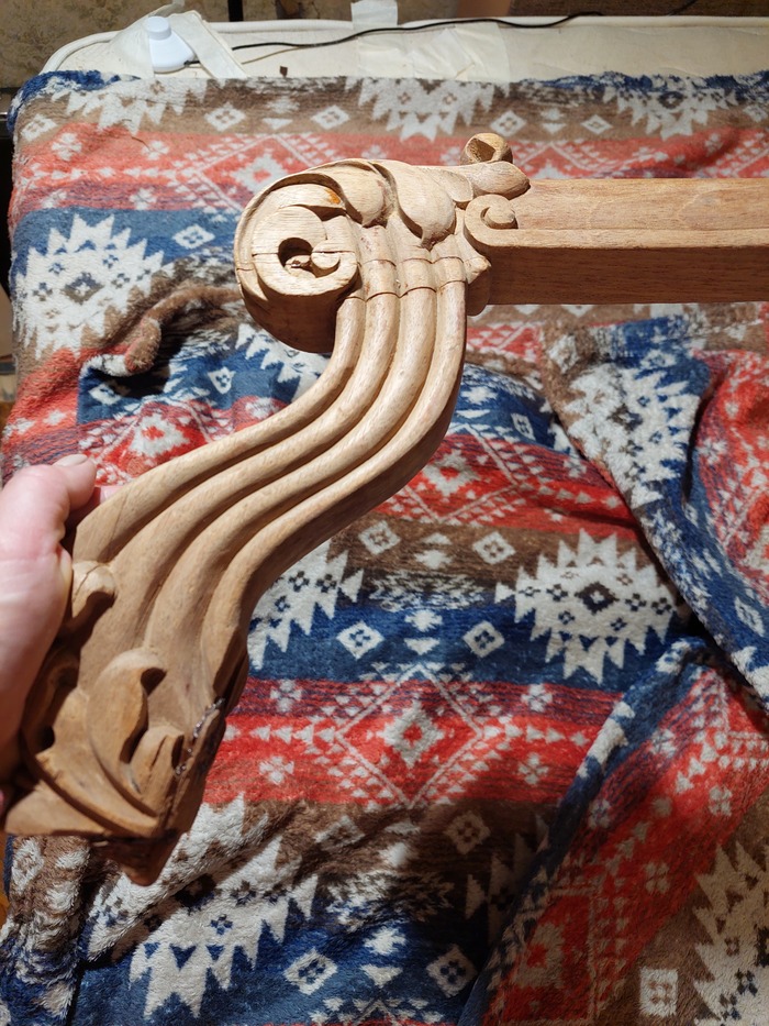 Расклеить всю эту красоту дело было сложным. Тут поработала карательная послевоенная реставрация. Часть элементов прибиты гвоздями 10' и проеклеены "Моментом". Колдовать пришлось долго, но удалось все вытащить и прочистить, расклеить и зашпаклевать стыки фигурных элементов. Отдельно выкинула все пружины и внутрянку, оставив каркас вставной спинки. Его тоже пришлось мудрить и укреплять раму.