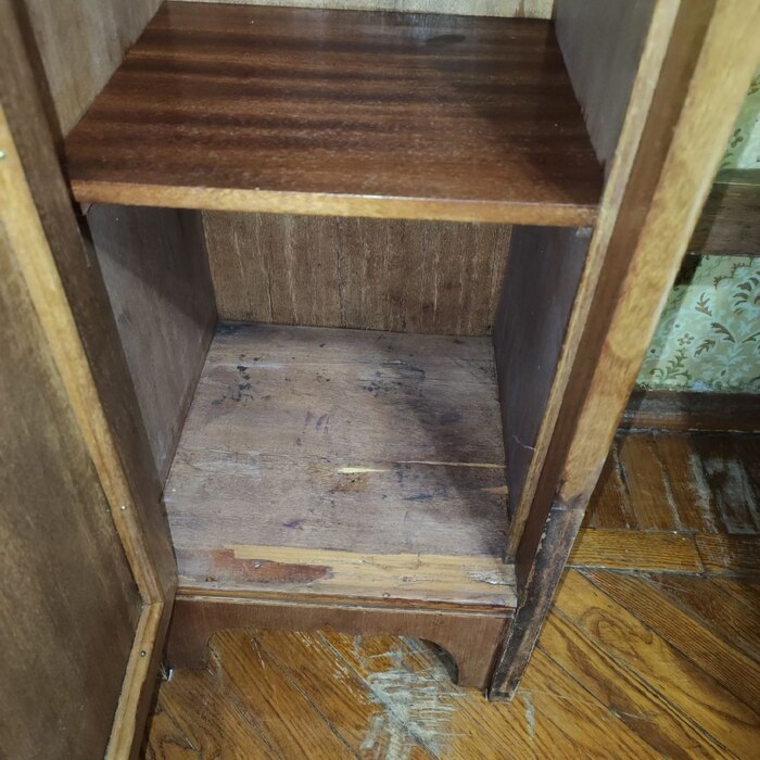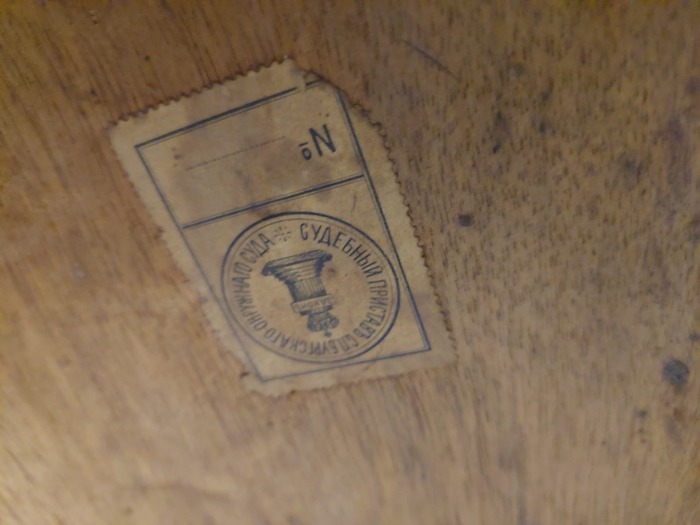 Каким-то чудом часть мебели из кабинетов не погибла в пожаре, а граждане из числа бывших служащих её растащили по домам. В том числе и наш прекрасный диван. Сзади, кстати, остался инвентарный номер и шильда. Да и следы пожара были читаемы: сзади и сверху копоть, а полки повело от воды.