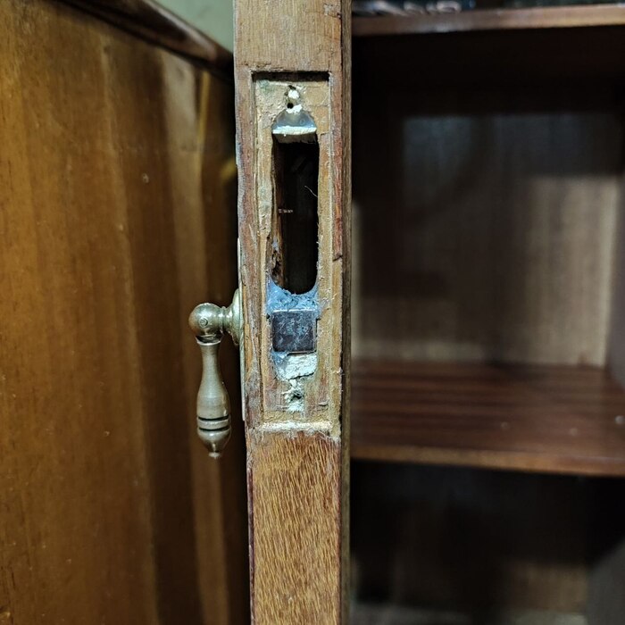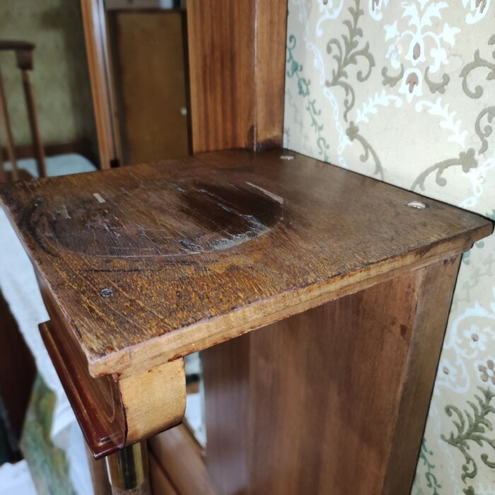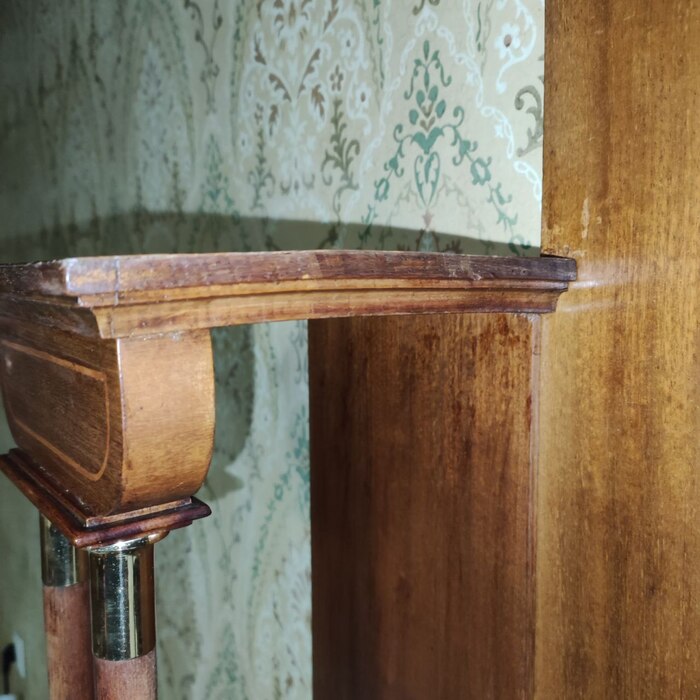 На переборку ушло 2 недели. Накладки, по форме повторяющие элементы,сделали из старой латуни, ножку залили эпоксидкой, заново залачили и отполировали латунные элементы полок.