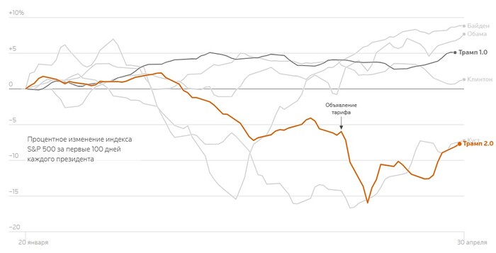 С начала срока Трампа индекс S&P упал более чем на 7%, что значительно ниже показателей остального мира. Европейский STOXX 600, который годами отставал от рынка США, за это время вырос на 0,2%, в то время как китайские «голубые фишки», наиболее подверженные влиянию мировой торговой войны, упали всего на 1,4%. Удар для иностранцев оказался еще сильнее. В евро, иенах и фунтах стерлингов S&P потерял более 14%.