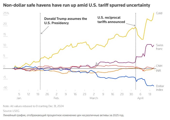 Только за апрель доллар упал более чем на 4%. Если не считать позднего восстановления, это станет самым большим падением с конца 2022 года, или если падение продолжится, то до глубин мирового финансового кризиса середины 2009 года.