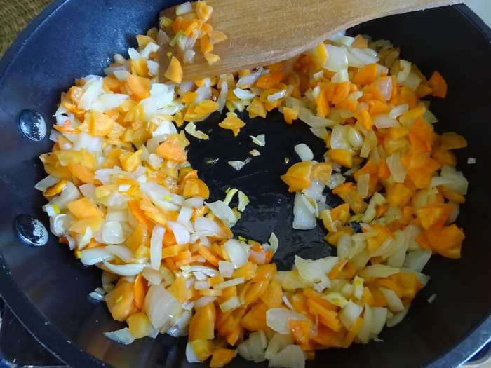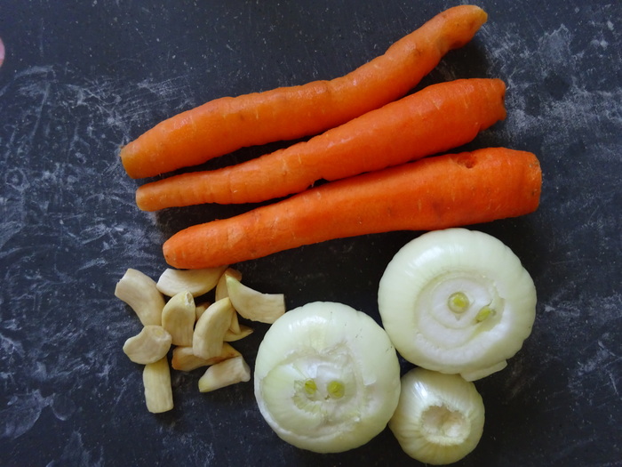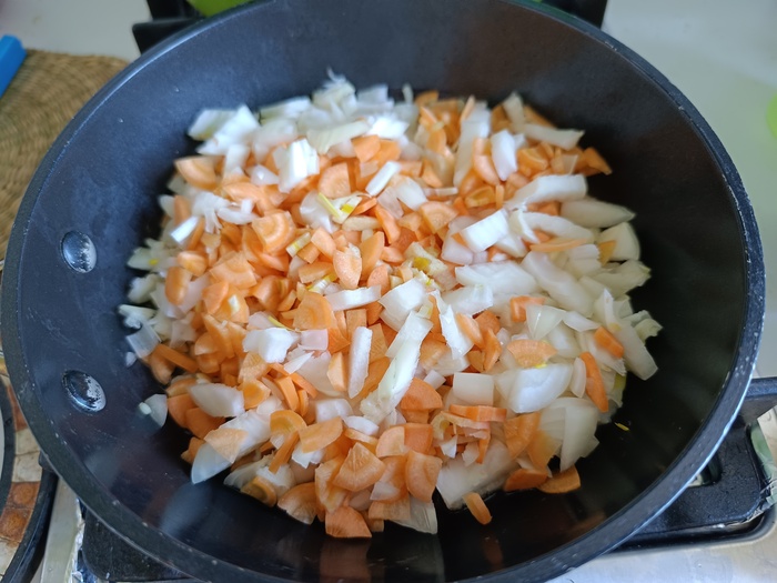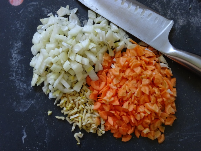 Пока картошка варится занимаюсь остальными овощами. Морковь, лук и чеснок чищу, режу и делю на две равные части. Первая часть уходит в кастрюлю по мере нарезания.