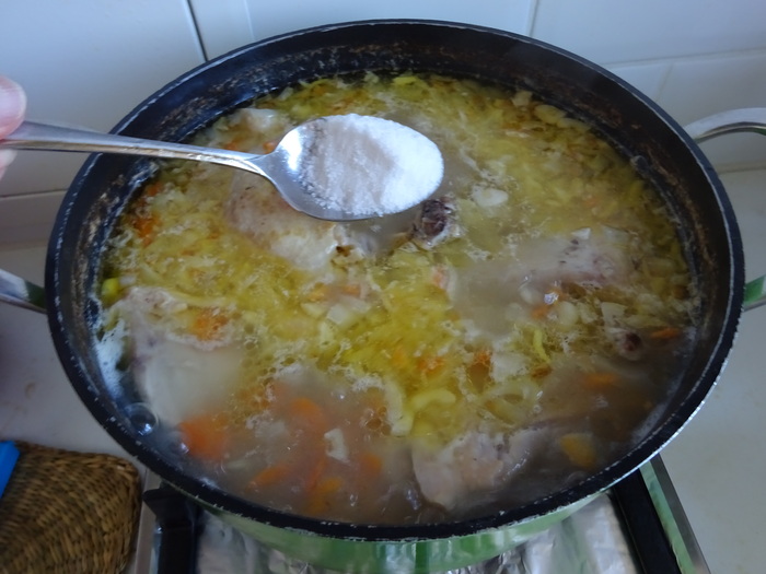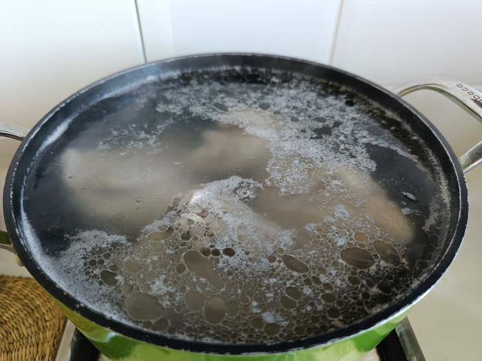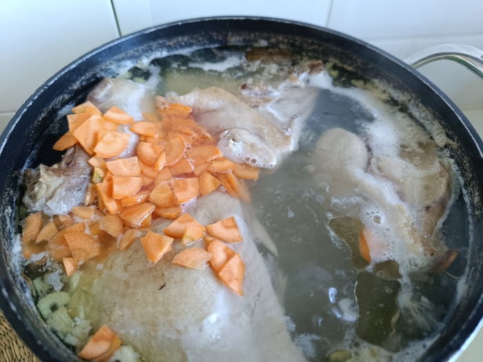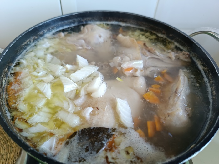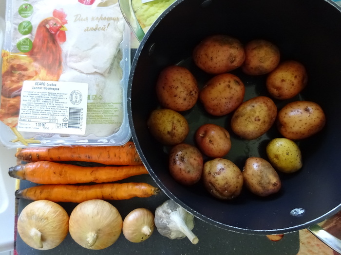 В этом супе у меня давно отлажен техпроцесс, пока что-то варится, что-то остальное режется, я торможу и делаю всё медленно, но верно, и как раз успеваю резать одновременно с варкой. Короче, распаковываю куриные бедра, по одному вытаскиваю, промываю под струей воды и кладу в кастрюлю, потом заливаю холодной водой, ставлю на плиту на максимальный огонь и дожидаюсь закипания. Предостерегаю шустрых пикабушников от "вбултыхивания" в кастрюлю всей упаковки сразу, потому что там довеском идет консервант в пакетике - так вот его варить не надо. Кстати, на будущее - с фаршами таким же макаром в готовку могут уходить салфетки, причем они там вообще под цвет фарша, не забывайте. Воды заливаю на 1 см ниже верха, но если бы мне нужен был куриный бульон для других нужд, залил бы больше - хозяйке на заметку. А так с учетом испарения и добавления овощей на выходе как раз будет почти полная кастрюля.