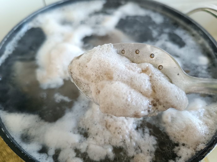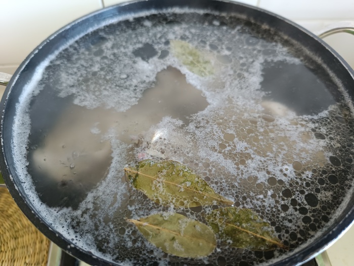 Дождался закипания, убавляю огонь, снимаю пену, добавляю в бульон лавровый лист (4 листика) и чёрный перец горошком (8 горошин), прикрываю крышкой, чтобы меньше испарялось и оставляю пока кастрюлю в покое изредка снимая остатки пены и одним глазом следя, чтобы не убежало.