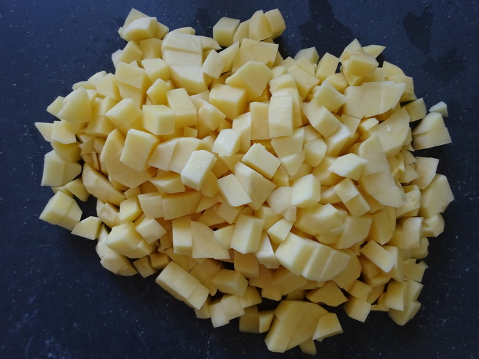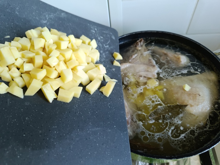 Варю куриный бульон полчаса минимум на тихом побулькивании, тем временем чищу и режу картошку и остальные овощи, если успеваю. Через полчаса закидываю всю картошку, прибавляю огонь, чтобы снова закипело, потом уменьшаю и снова прикрываю крышкой.