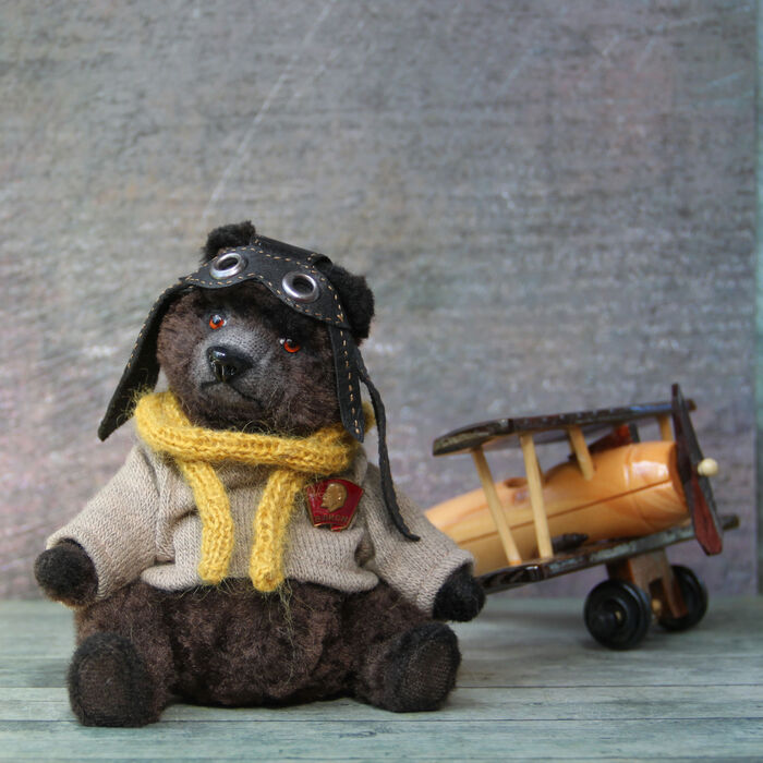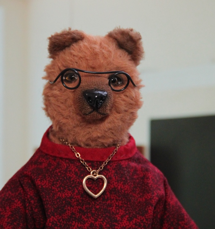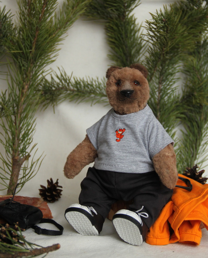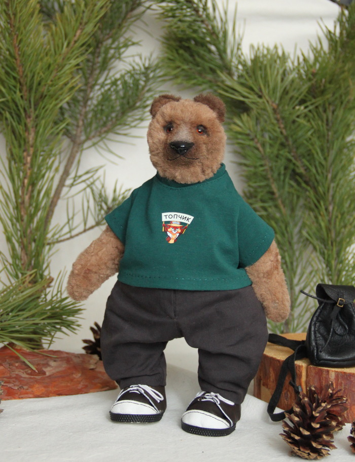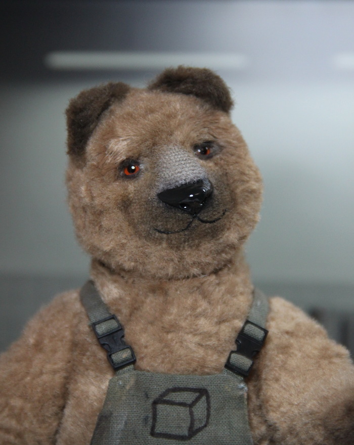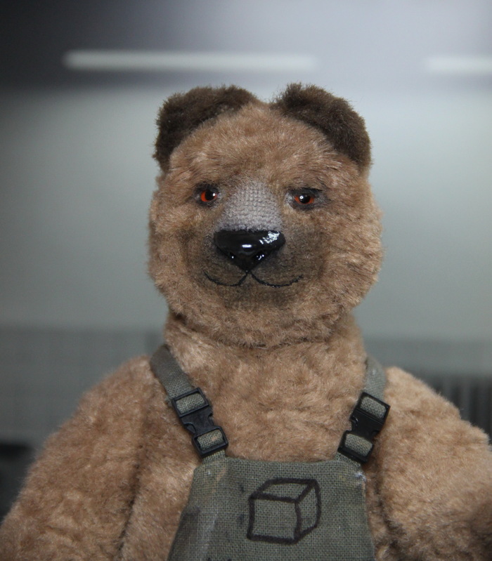 Классический мишка-тедди, 15 см.ростом. Только сидит, руки-ноги-голова крутятся. Внутри опилки и гранулята жменька, снаружи вискозный мех, шплинтовое крепление конечностей.