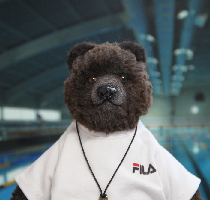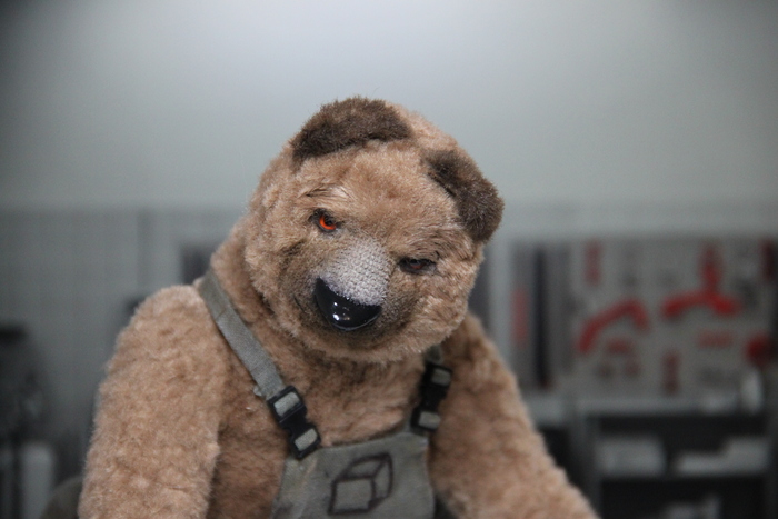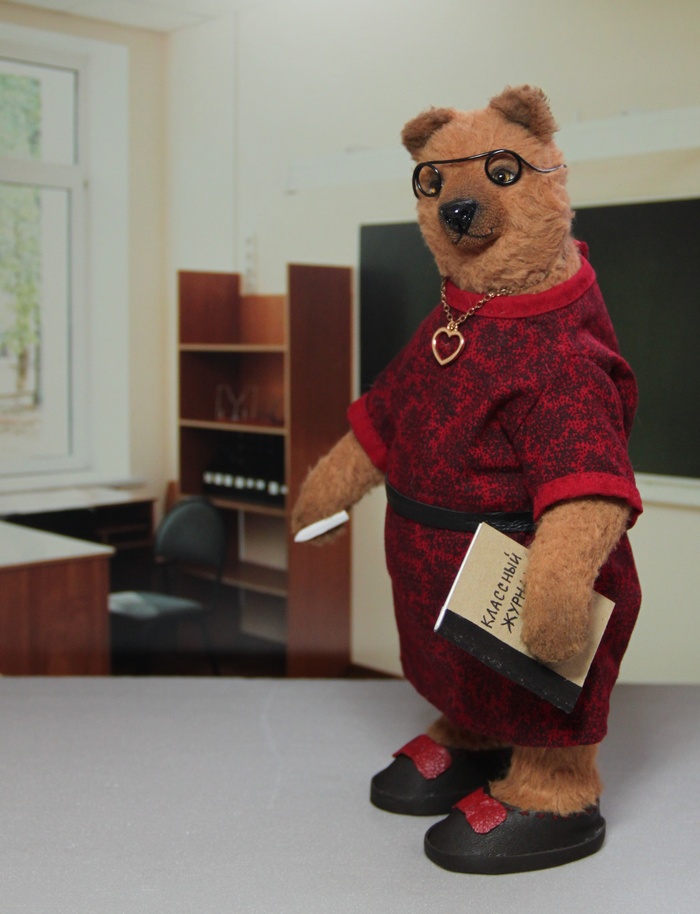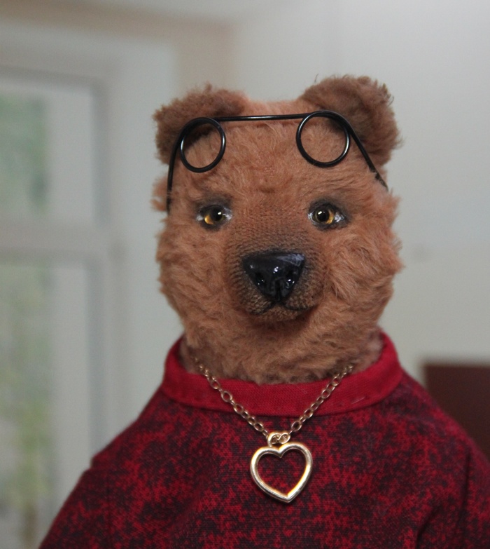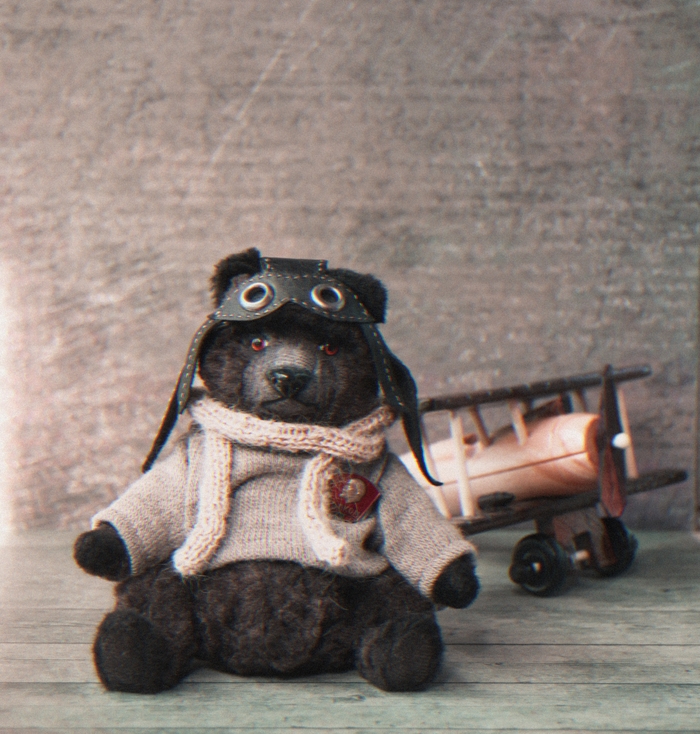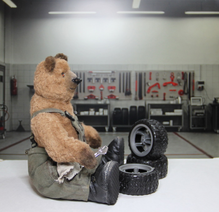 Классический мишка-тедди, 15 см.ростом. Только сидит, руки-ноги-голова крутятся. Внутри опилки и гранулята жменька, снаружи вискозный мех, шплинтовое крепление конечностей.