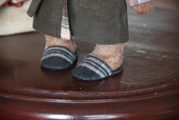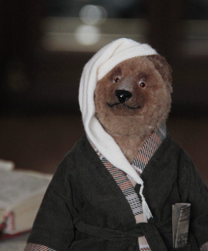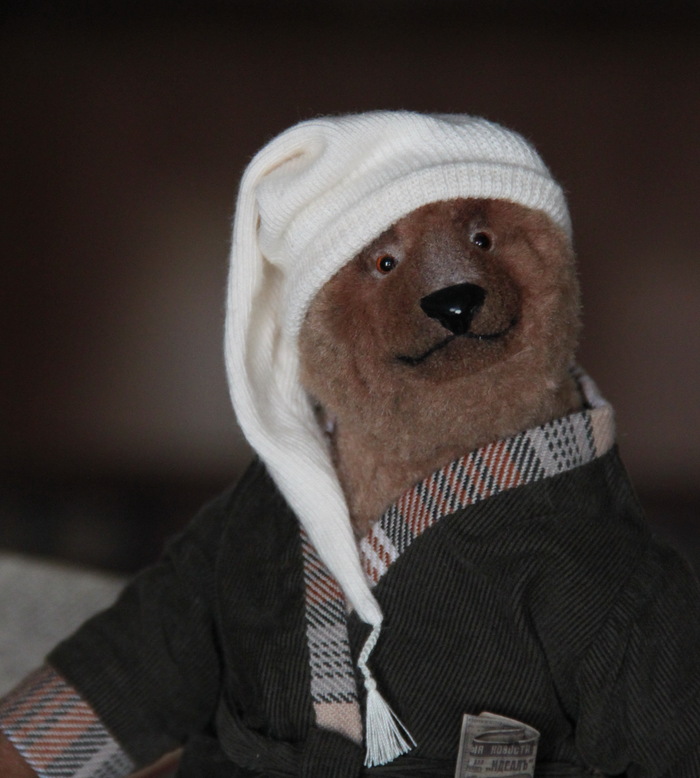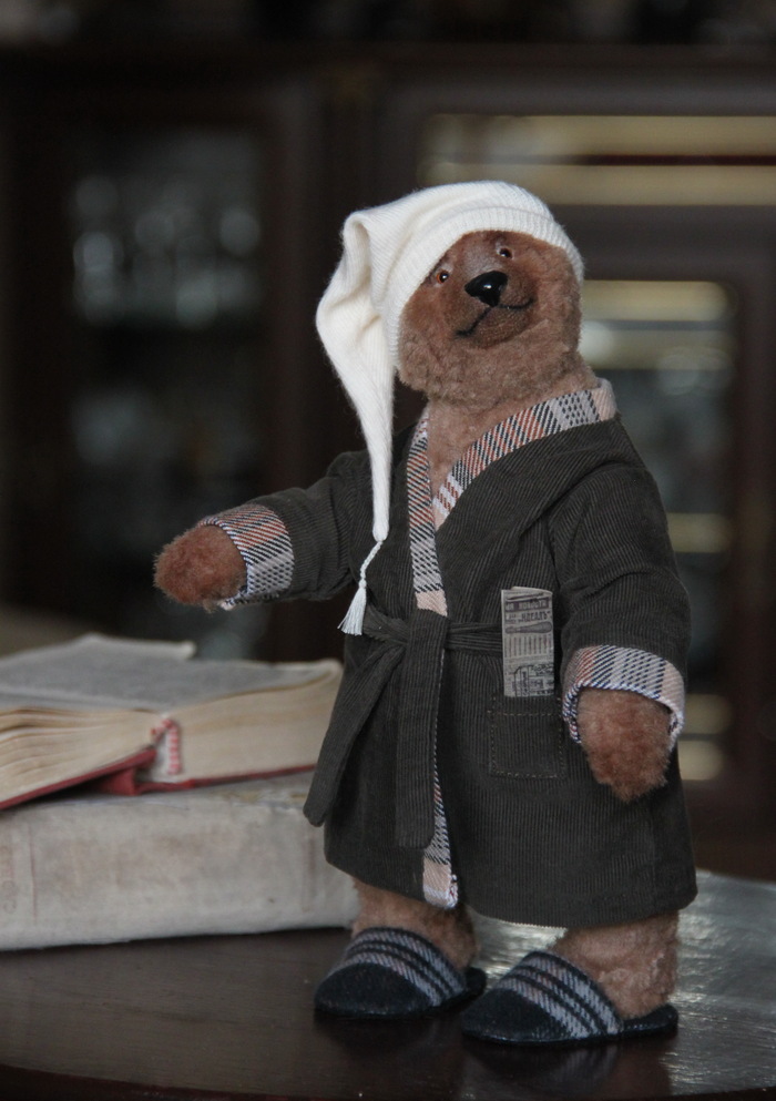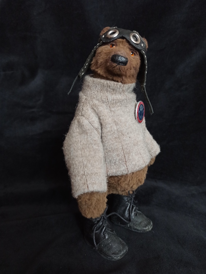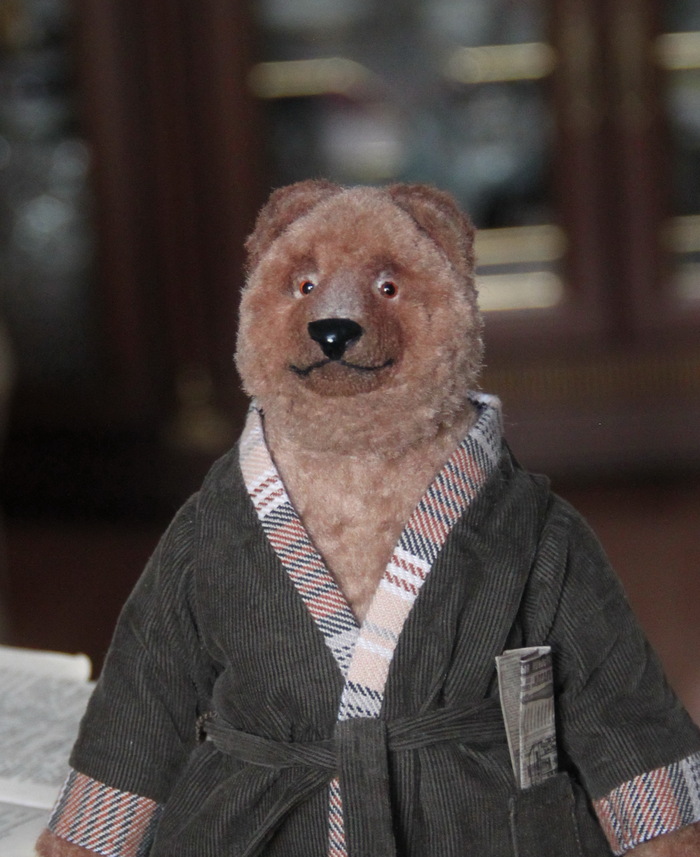 Все как всегда для тедди - шплинтовое крепление головы и конечностей, итальянско-французская вискоза, внутри опилки и гранулят. Лепной нос, тонировка маслом, одежда снимается.