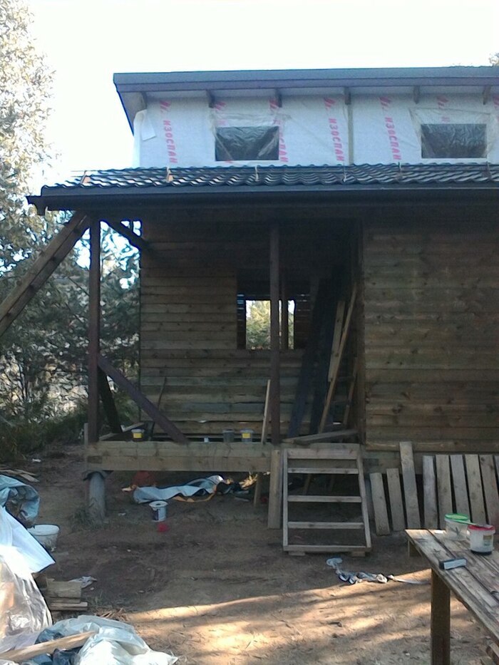 В конце сезона, а закончили мы его на сей раз раньше - в сентябре, дом был накрыт кровлей, зашит доской снаружи, и я сделал пол на веранде. Даже столбы, которые должны были стать, и, собственно, стали декоративными - покрасил, как и лобовые доски.