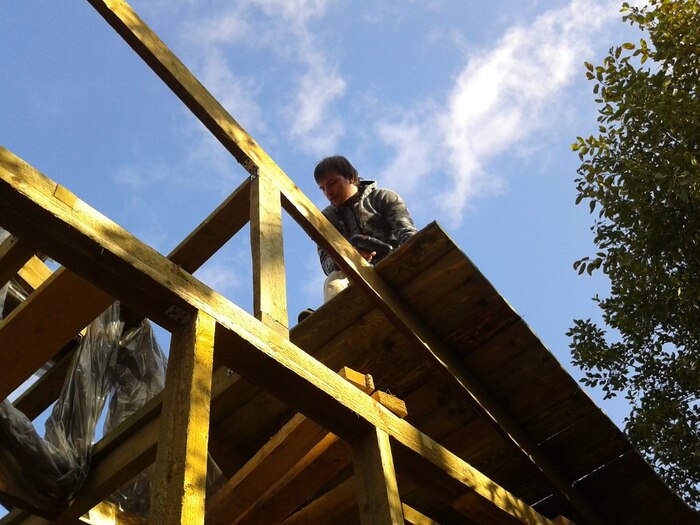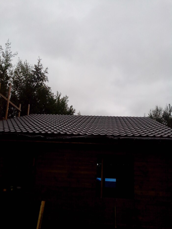 Вообще мы стали активно готовиться делать постоянную кровлю. Для этого стали сооружать леса, чтобы была возможность нормально крепить крайние листы.
