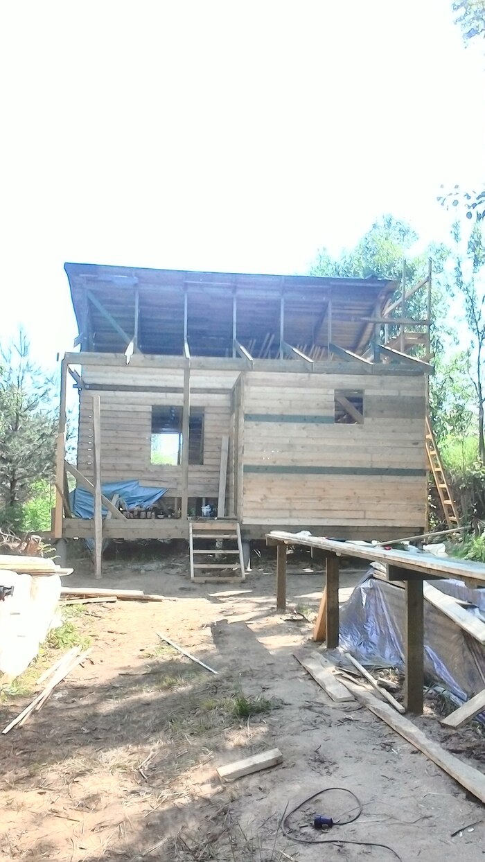 Кровля была заказана. Сразу с водосточкой, снегозадержателями, и всеми "плюшками". В отпуске предстояло сделать крышу, а для этого нужно было ещё разобрать временную, доски с которой, к слову, отлично подсохли за зиму. Ещё нужно было что-то решить со стропилами, ведь шаг в метр при таком то уколне и длинне ската, мог привести к очень неприятным последствиям. К слову, с зимой в том году повезло - снега было мало. Возможно поэтому дом не сложился.