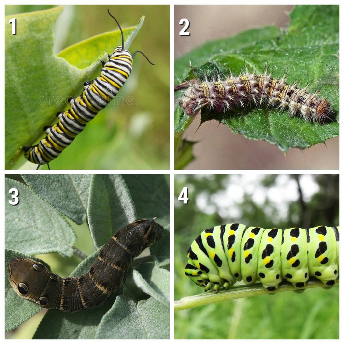 Правильный ответ 1. Гусеница бабочки монарха. 2. Гусеница бабочки репейницы. 3. Гусеница бабочки бражника. 4. Гусеница бабочки махаона.