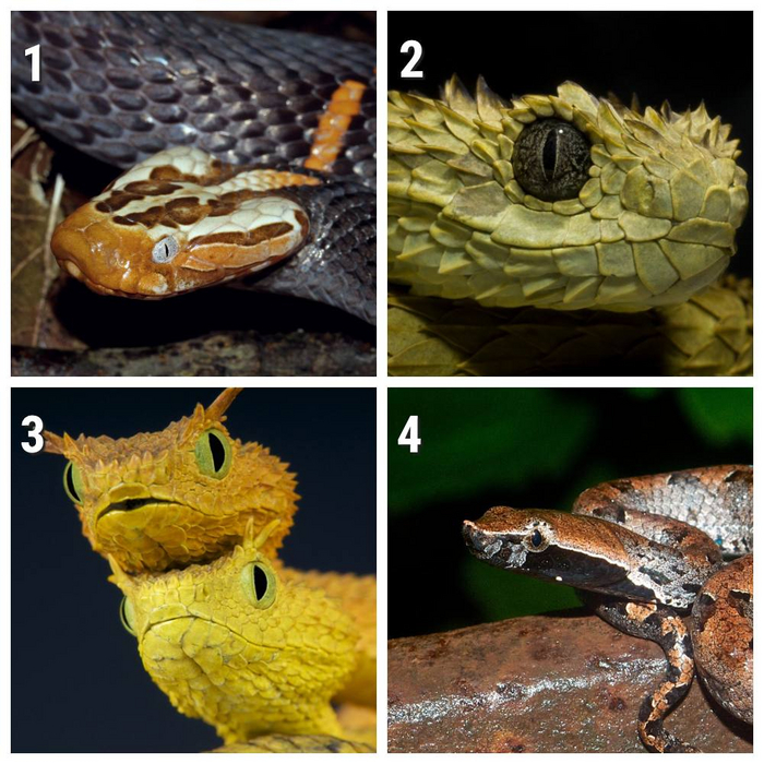 Вопрос №3. Какая змея, из представленных на коллаже, НЕ является гадюкой, то есть не входит в семейство гадюковых?