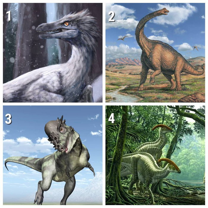 1. Троодон. 2. Брахиозавр. 3. Пахицефалозавр. 4. Паразауролоф.