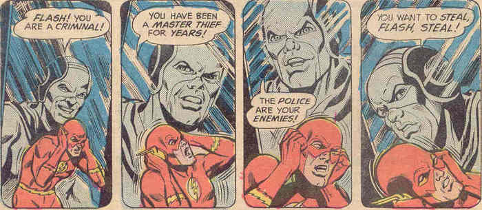 Судя по обложке комикса The Flash #198, Флэш долбанулся. И это так! Устраивая благотворительное представление для детей, Алый Скороход ловит маслину в голову (не смертельно, по касательной прошла) – и деградирует, становясь в душе восьмилетним мальчиком. Подростки, ради которых он выступал, теперь вынуждены охранять его от бандитов, потому что наивный и боязливый восьмилетний мальчик не намерен с ними сражаться. Впрочем, пока дети отмахиваются от бандитов, Барри начинает молиться богу, чтобы тот сделал его Флэшем по-настоящему, ему на голову падает камень (а ведь у Барри с собой не было маски рыжей обезьяны), и Флэш вспоминает, кто он таков, и легко бандитов обезвреживает. Шах и мат, аметисты!