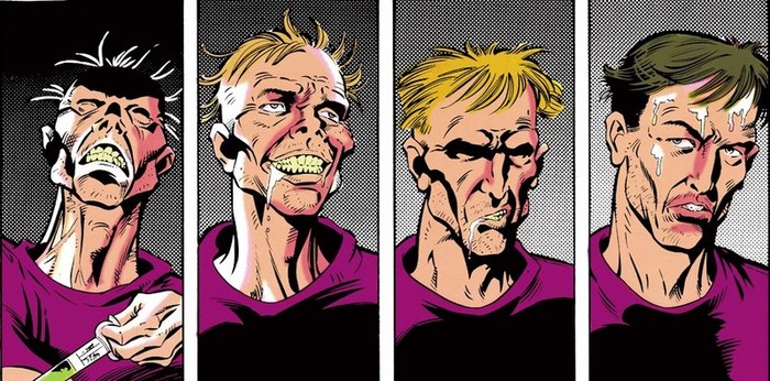 А сегодняшний забег пора бы и закруглять. Временную остановку предлагаю сделать на комиксе The Flash #13 за июнь 1988 года. Вандал Сэвидж принимает у себя в гостях двоих нариков, крепко подсевших на «Скорость 9», и выдаёт им новое задание – ворваться на вечеринку, которая проходит в доме Ника Басальи, и принести оттуда гостинцы – ноги Уолли Уэста. Самого Уолли Уэста можно не доставлять, его ног хватит. Напомню для тех, кто с комиксами незнаком: Вандал Сэвидж – людоед, и окорочка скорохода для него наверняка являются деликатесом. Ну и заодно пусть прихватят денег и драгоценностей, ведь бедные люди на ту вечеринку не приглашены – только богачи.