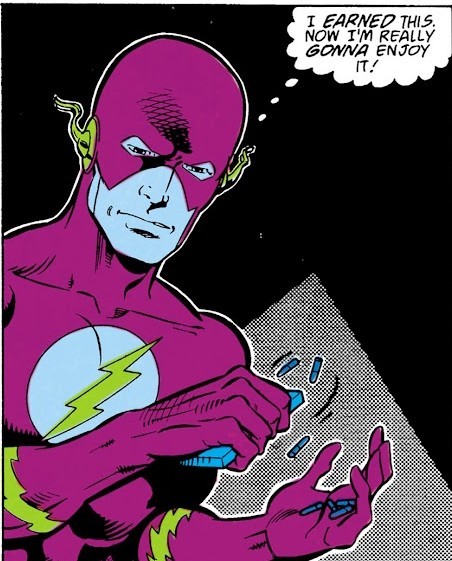 Можно перейти к комиксу The Flash #12 под названием “Скорость 9». В городе объявляется сверхбыстрый преступник. Он крадёт 250 тысяч долларов – и отдаёт таинственному нанимателю, а в качестве платы получает наркотик, от которого перекошенная харя вора принимает несколько более человеческий вид. Такие ускоренные ограбления повторяются ещё несколько раз – и полиция приходит в гости к Уолли Уэсту, чтобы испросить его совета. Уолли несколько не до этого сейчас, ему бы решить проблему отношений его мамы с его девушкой – мать Уолли поселилась у него дома и на дух не переносит Тину МакГи. Возможно, потому что Тина на 12 лет старше Уолли. А может, потому что она не любит фирменный ростбиф миссис Уэст. Кто знает?