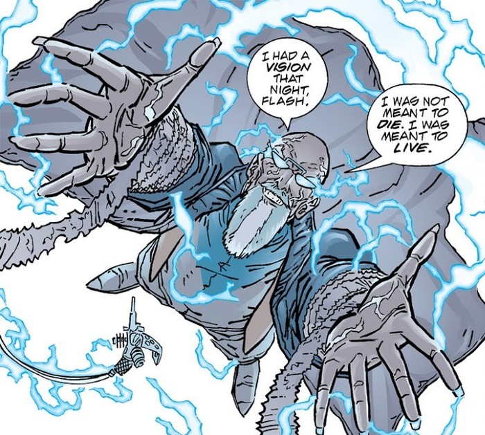 Когда Флэш приходит в себя (увидев кошмар, в котором был Джей Гаррик с демоническим оскалом), к нему в камеру приходит соцработница, представившаяся Фионой. Она даёт Флэшу попить – а затем требует, чтобы Уолли ответил на несколько вопросов (и уточняет, что в воде была сыворотка правды). Фиона утверждает, что Уолли Уэст – просто поехавший, что нет и не было никогда никакого Флэша. Но Уолли понимает – это не он свихнулся. Его в этом убеждают две вещи – во-первых, обручальное кольцо на его пальце, а во-вторых – его костюм. Костюм Флэша состоит из чистого, рафинированного Спидфорса, принявшего твёрдый вид, и его так и не смогли снять. Значит, какая-то связь со Спидфорсом ещё есть. Через окно Уолли видит Барри Аллена – и пытается провибрировать сквозь стену, чтобы поговорить с наставником. Но суперскорость не работает…впрочем, спасение приходит, откуда не ждали. Охранника (в котором Уолли узнал Мика Рори, Тепловую Волну) замораживает и убивает Капитан Холод!