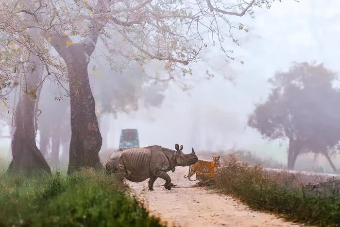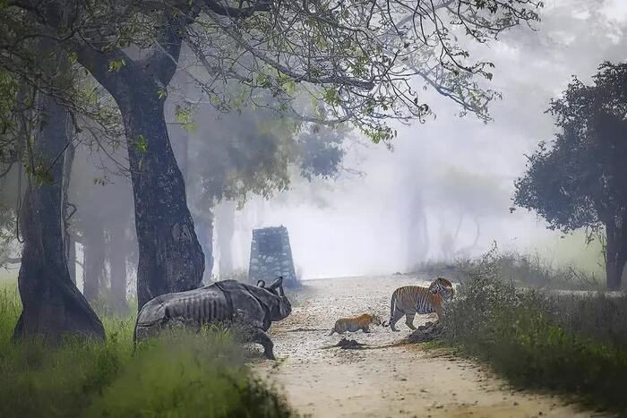 На снимках: атакующий носорог, бесстрашная тигрица и зажатый между ними крошечный тигрёнок.