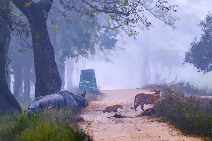 Тигрица с тремя крошечными детёнышами вышла на туманную тропу. Внезапно из чащи, откуда ни возьмись, появился огромный носорог и стал приближался к тигрёнку, который немного отставал от матери. Почувствовав угрозу, отважная тигрица с громким рёвом повернула назад, удерживая двоих малышей позади себя. Носорог вынужден был изменить направление движения, чтобы избежать конфликта.