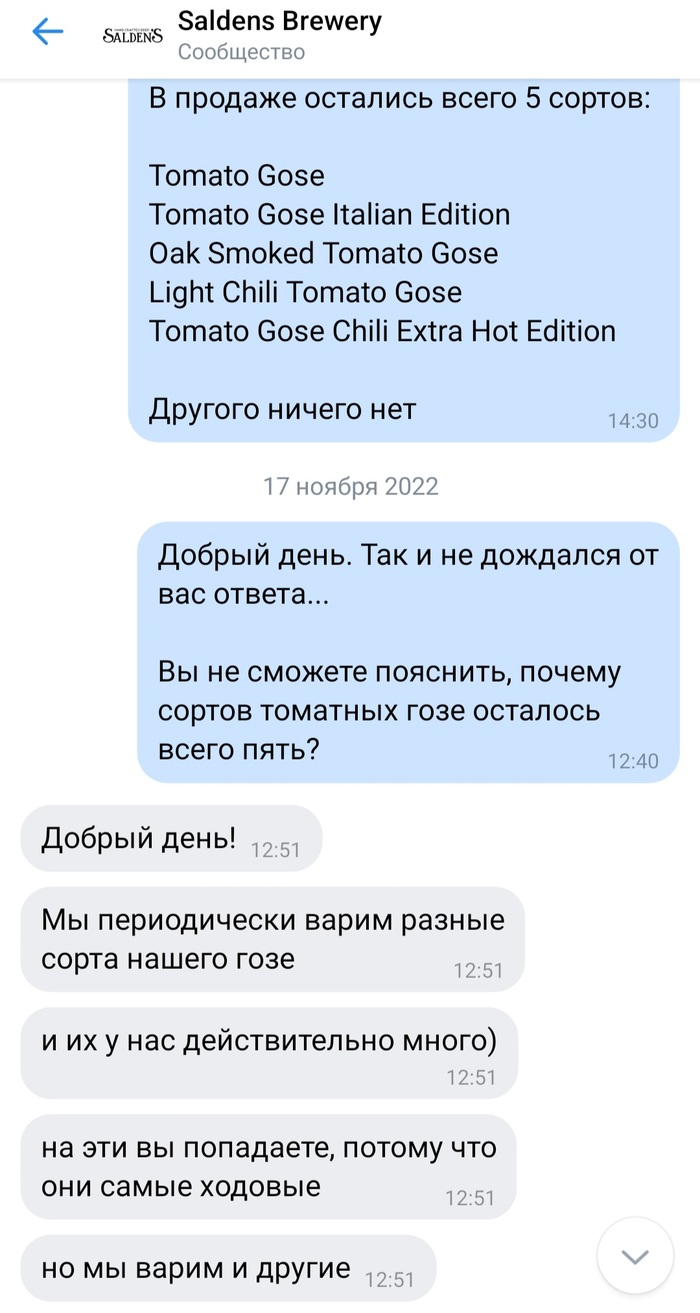 Я бы, возможно, не уделял бы столько времени данной теме и конкретно переписке с представителем пивоварни, если бы за почти три прошедших месяца что-нибудь да изменилось. Но увы, слова про "расширяемся", "мы варим и другие" так и остаются всего лишь словами. И как показало время, это не "я на них попадаю", а у Salden's попросту не осталось других сортов.